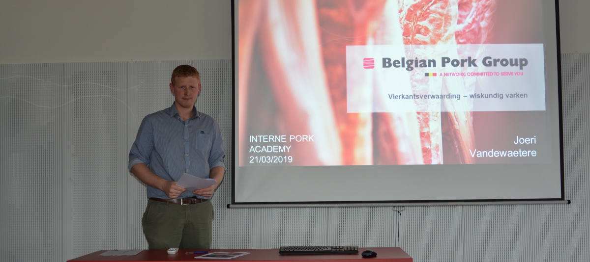 Vorige week opende onze Pork Academy opnieuw de deuren. Via dit intern opleidingsproject krijgen onze werknemers de kans om nog meer kennis op te doen over ons bedrijf, product en sector. Cost controller Joeri was de lesgever van dienst. Hij onderrichtte een 40-tal nieuwsgierigen over het onderwerp ‘Vierkantsverwaarding – wiskundig varken’. De afwezigen hadden ongelijk, maar krijgen van Joeri nu een herkansing.